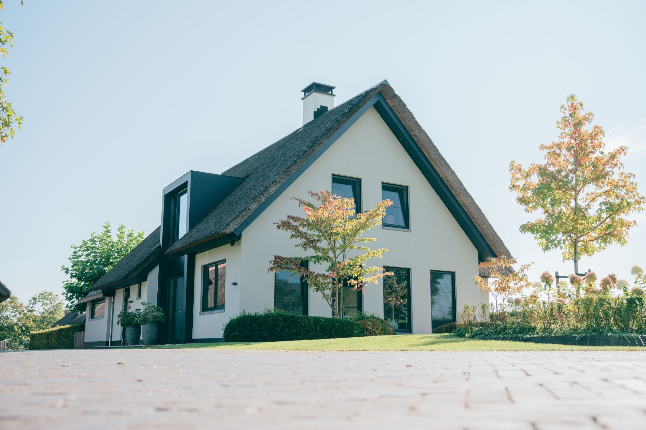 Luxe woning in Ede met rieten dak en royale raampartijen, naadloos geïntegreerd in de landelijke omgeving